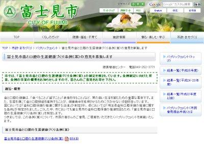 富士見市(埼玉県)では、「富士見市歯と口腔の生涯健康づくり条例」の制定に向け、条例の素案の概要を公表。この条例(案)について、市民の意見、提案を募集するパブリックコメントを実施している。